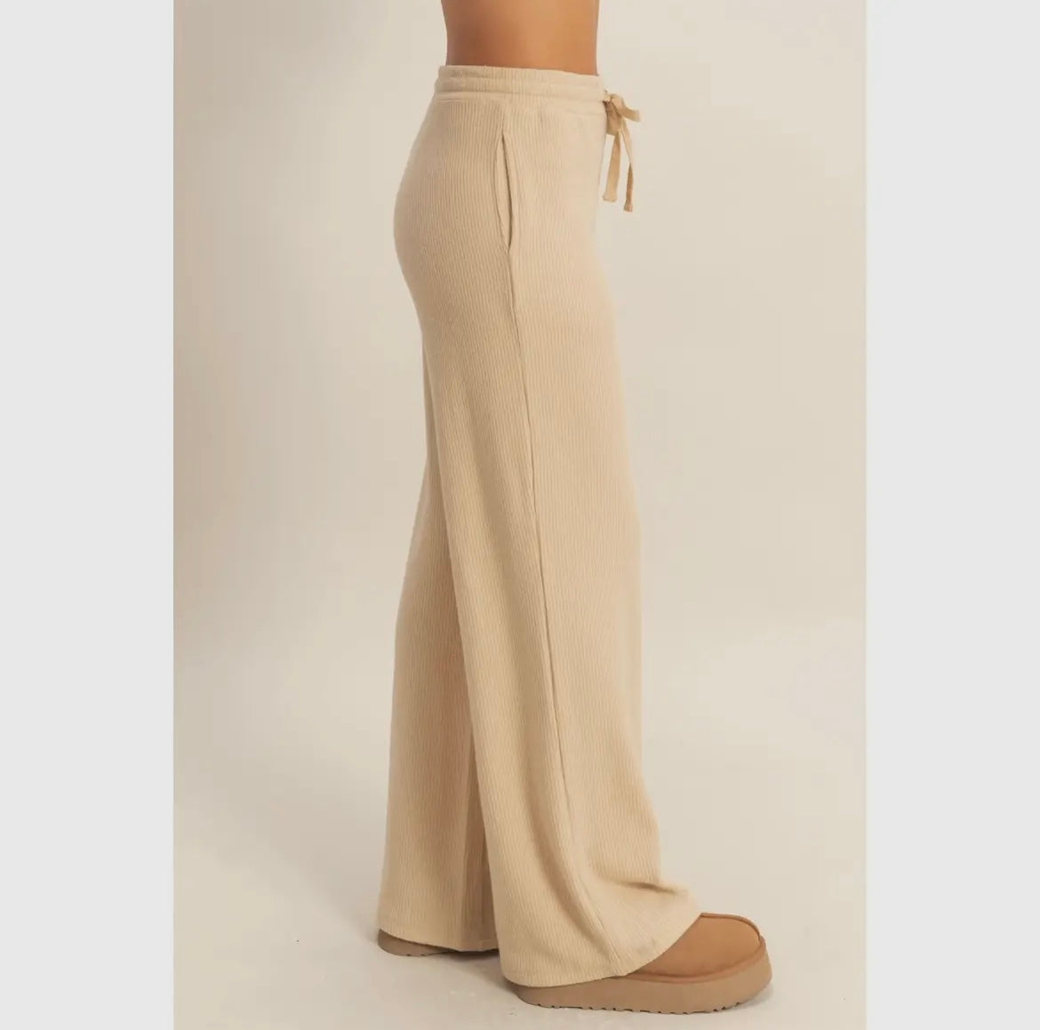 This 2 piece set includes the relaxed fit Top and wide leg pantsSuper soft brushed waffle knitAdjustable drawstring wide leg pantsRelaxed fit topComes in 2 colors!
